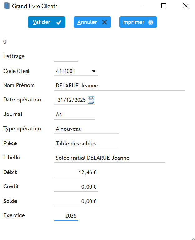 En termes de bonne pratiques, il convient de bien remplir les champs comme par exemple dans l’exemple suivant qui concerne, pour un client donné, la saisie au 31/12/2018 du solde d’ouverture au 01/01/2019. Le solde peut être débiteur (le client nous doit de l’argent) ou créditeur (on lui doit de l’argent). Bien sûr, on ne saisit que les soldes différents de 0, ce qui en fin de mois et d’année, correspond à un tout petit nombre de nos clients.
