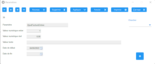 Dans le menu Paramètres\Paramètres généraux, il faut ajouter, en cliquant sur « Nouveau », un paramètre général avec les informations ci-dessus. Bien faire « Appliquer » avant de quitter cet écran.