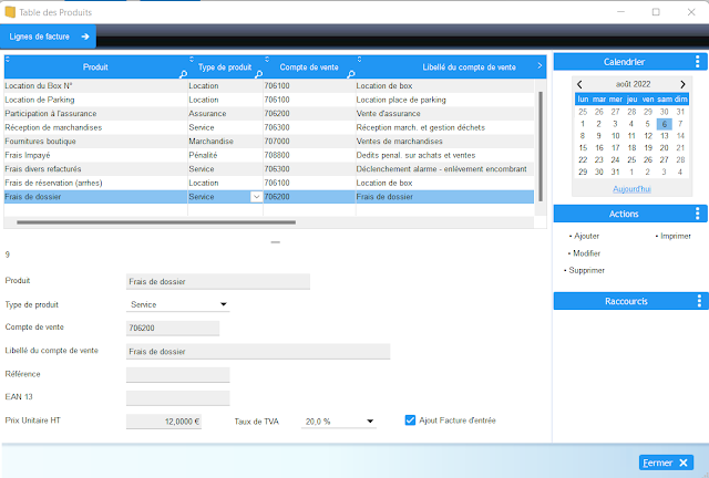 Créer dans la « Table des produits » (Menu Paramètres\Produits) le produit correspondant aux frais de dossier avec le bon prix HT, la TVA et surtout cocher pour ce produit l’option « Ajout Facture d’entrée ».